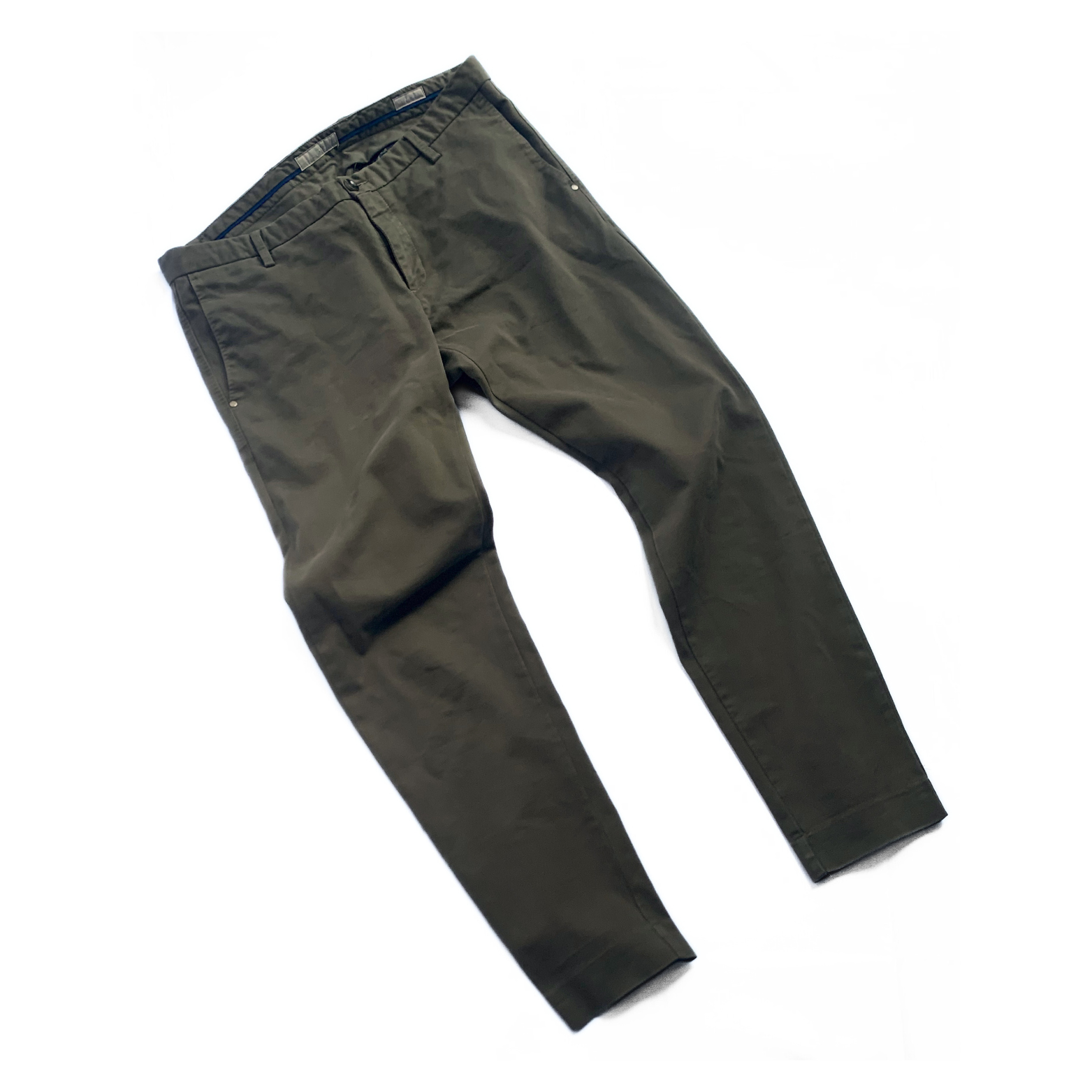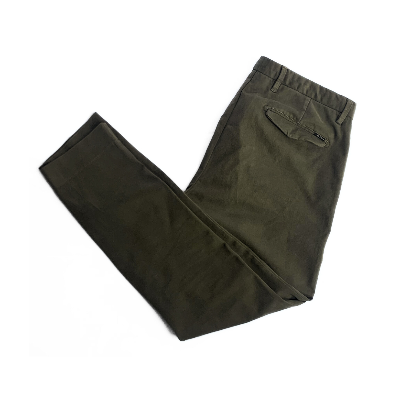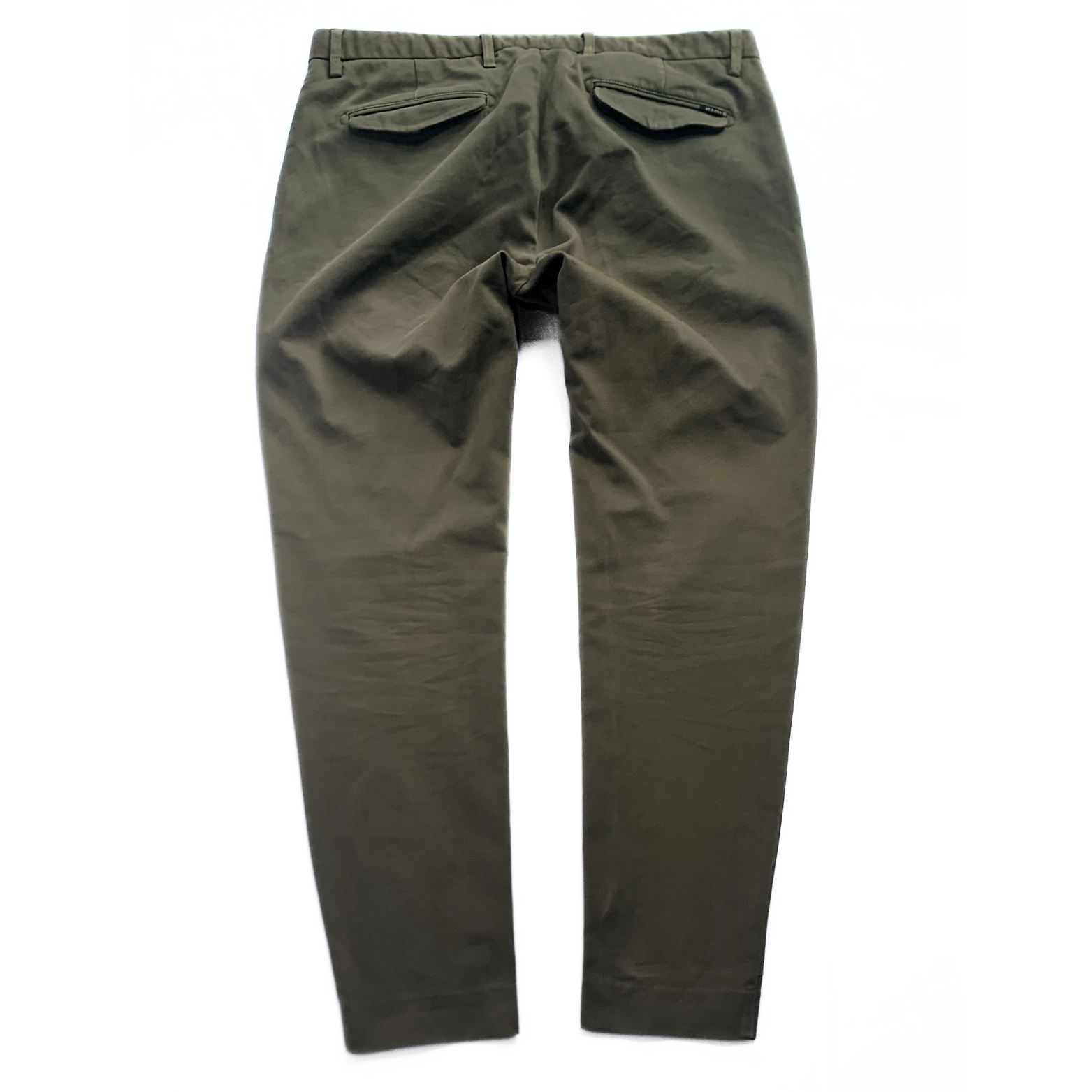 Slim fit chino in stretch tricotine fabric, garment-dyed. Model with cuffed hem, front closure with zipper and button, front pockets, and back welt pockets with flap. Military green. 97% cotton, 3% elastane. Stretchable. Midweight fabric. Size 50. Please refer to the images for item condition.